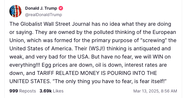 “O globalista Wall Street Journal não faz ideia do que está fazendo ou dizendo. Eles são controlados pelo pensamento poluído da União Europeia, que foi criada com o objetivo principal de prejudicar os Estados Unidos da América”, escreveu o ex-presidente.